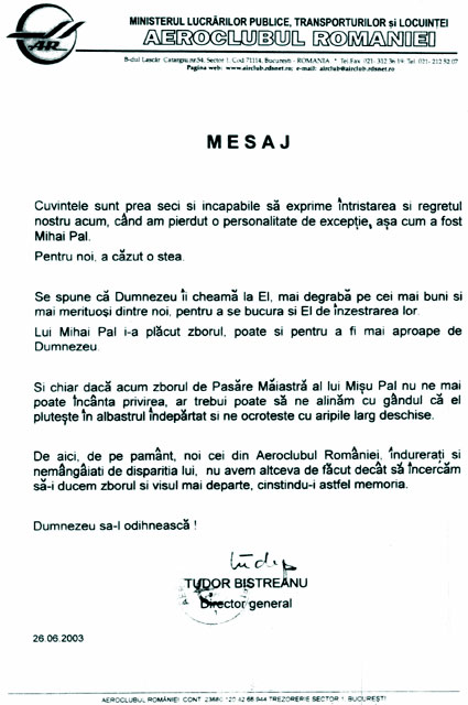 pierdem un coleg de zbor, Mihai PAL, un excelent acrobat, care